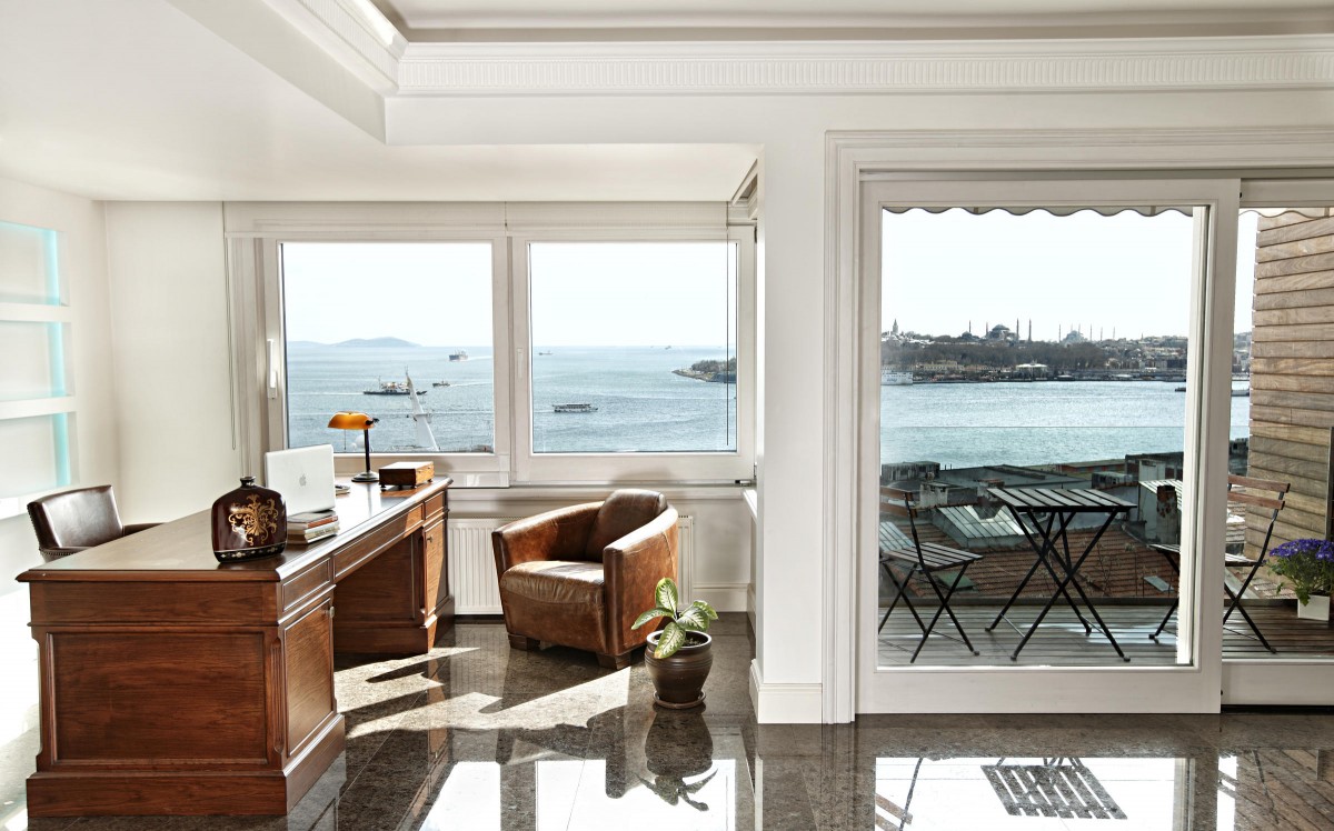 You won’t find a more remarkable view in all of Istanbul. The Bosphorus, the Marmara Sea, the Golden Horn and the historic skyline of Sultanahmet are all there to greet you upon entering the Blue Pearl. The spacious living room and office area lead directly to the balcony, from which you can enjoy both your morning coffee and breathtaking views.