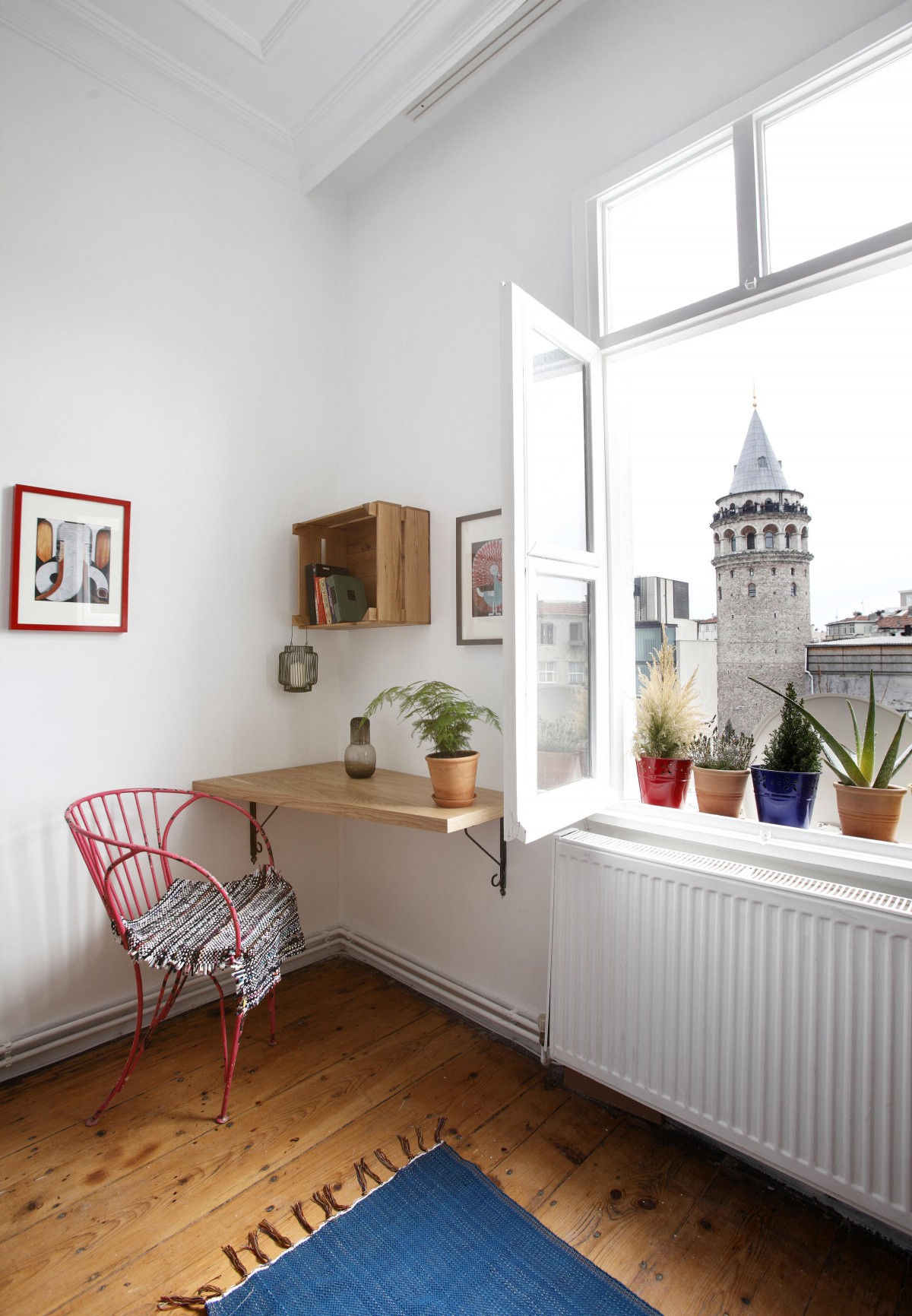 A fully equipped, modern kitchen, and a bathroom, with a large glass shower stall and original design features, round out this quiet, calm oasis. And it’s all just steps from the hustle and bustle of one of the most vibrant neighborhoods in all of Istanbul.
