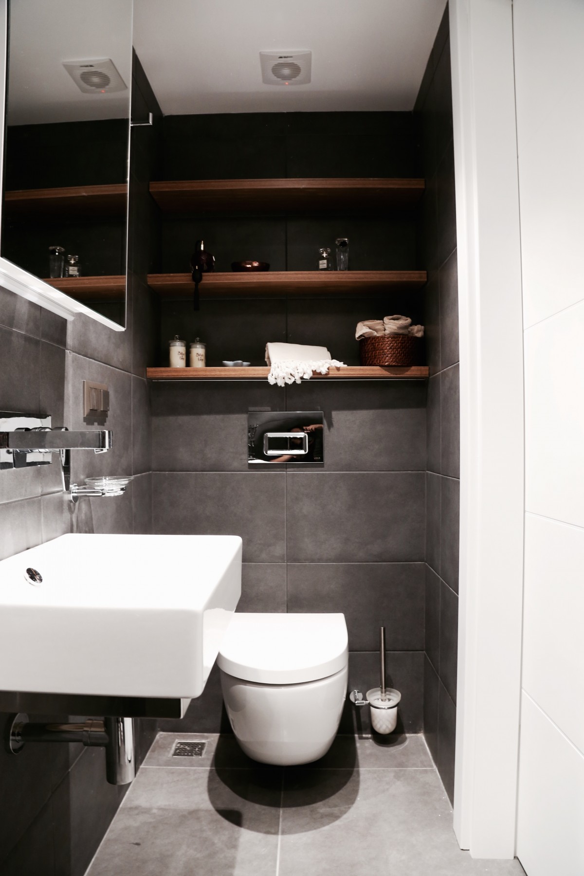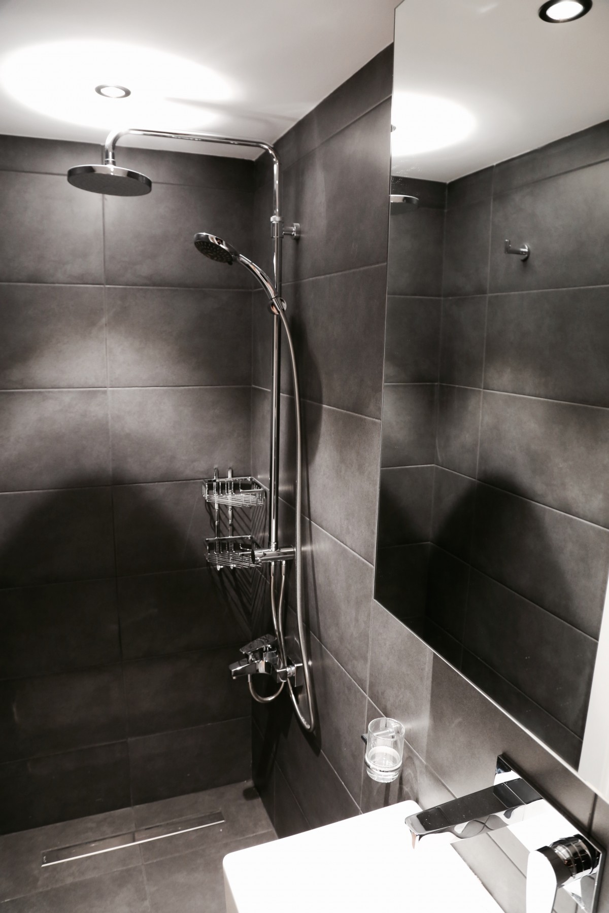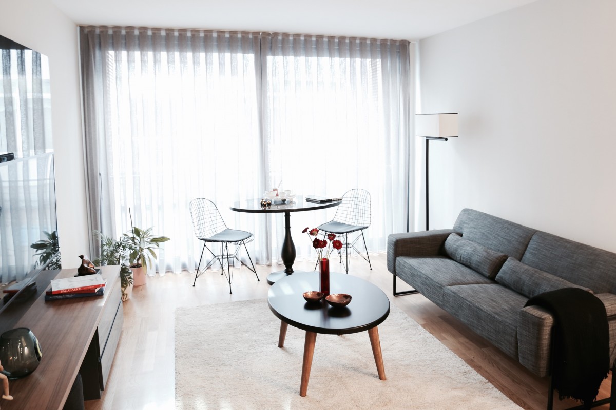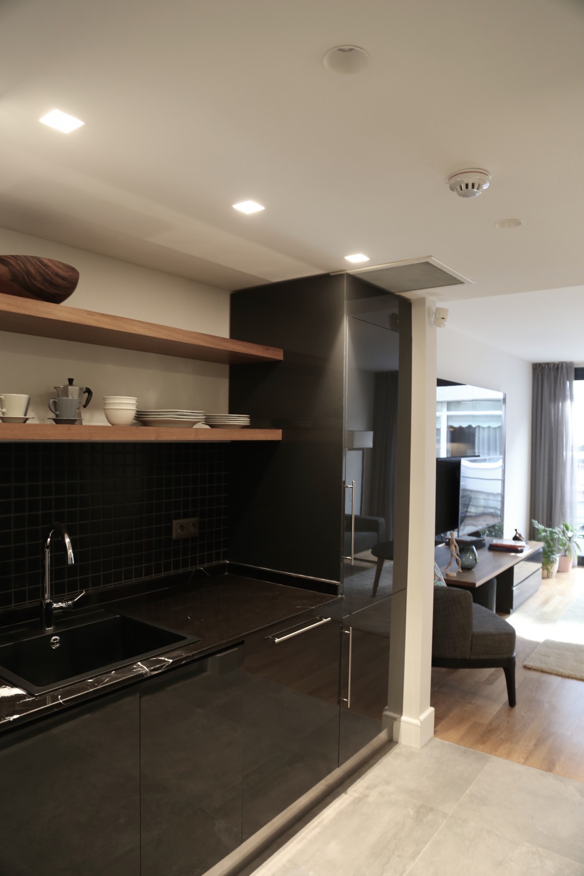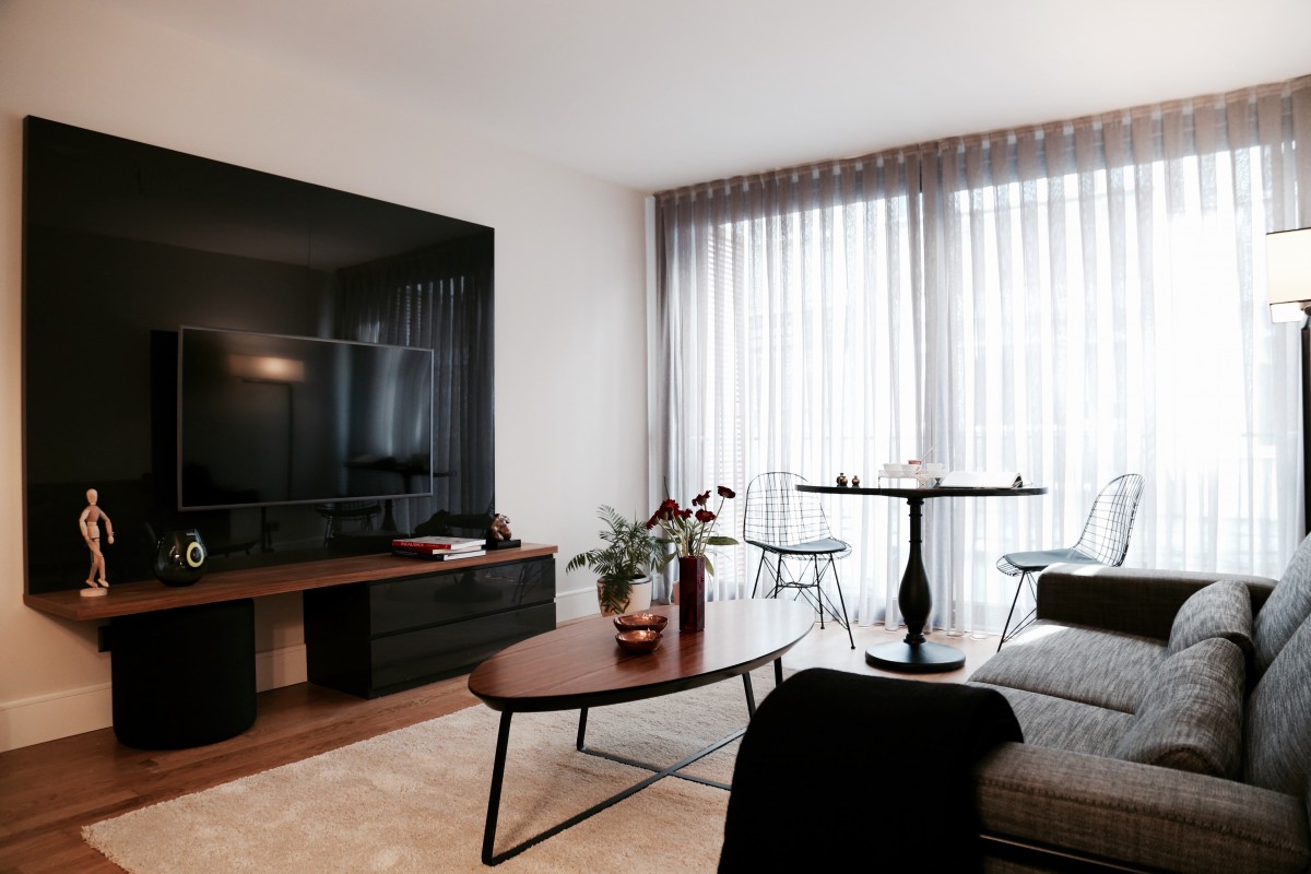 This cozy one bedroom flat fits right in with its monochrome colours and up-to-the-minute furnishings. You enter into a floor hallway, where you’ll find the open-plan kitchen area, which has sleek dark grey cabinets and black marble countertops. The large windows in the living area flood the space with natural light, while the custom made sofa, coffee table, armchair and LCD-TV screen make it the perfect place to kick back and make yourself comfortable. There’s also a plenty of space to spread out, should you need to work. Across the hallway from that is the guest toilet and then through the final door there’s the master bedroom. More simply decorated in black, grey and wood color, this room has a comfortable queen-size bed flanked by matching side tables. The bedroom includes an own modern bathroom with a smart, walk-in shower stall. In addition, the bedroom also has a small balcony where a tiny table and two chairs fit comfortably.